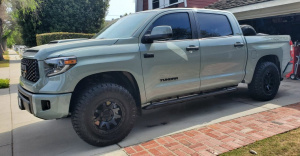 Method 314 18" wheels. 295/79R18 Tires. Falcon kit with .25" top plate spacers and 1" rear blocks. Front struts on level setting.